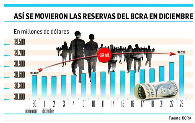 El efecto cascada muestra un robustecimiento de las reservas brutas del Central, que se ubican actualmente en u$s39.216 millones, lo que implica un crecimiento de u$s564 millones respecto de lo observado hasta el 30 de noviembre. Un dato no menor es que, en lo que va del mes, el oro (metal precioso con el que cuenta el BCRA) mejoró su cotización 5,8% y hubo una leve alza en los depósitos privados en dólares. Esto último, posiblemente se deba a que algunos ahorristas busquen que la foto fiscal al 31 de diciembre los muestre con posiciones en el país.