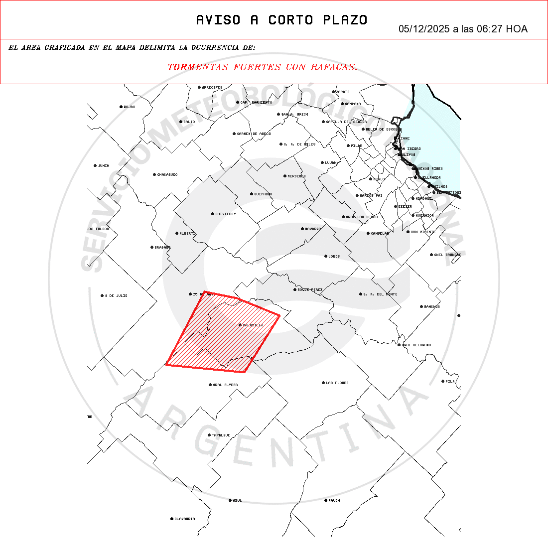 - Medidas de protección: 1- Retirá o asegurá objetos que puedan ser arrastrados por el viento. 2- Cerrá y alejate de puertas y ventanas. 3- No te refugies debajo de marquesinas, carteles publicitarios, árboles o postes. 4- Permanecé en construcciones cerradas como casas, escuelas o edificios públicos. 5- Mantenete alejado de artefactos eléctricos y evitá el uso de teléfonos con cable. 6- Si estás al aire libre, buscá refugio inmediato en un edificio, casa o vehículo cerrado. 7- Para minimizar el riesgo de ser alcanzado por un rayo, no permanezcas en playas, ríos, lagunas o piletas.