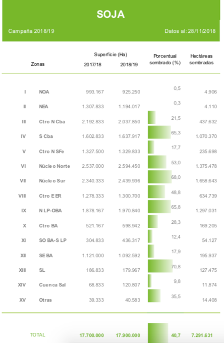 Durante la última semana, el avance de siembra incorporó dos millones de hectáreas de soja a lo largo de toda la región agrícola. Más del 80 % de dicha superficie se ubica en las regiones Centro-Norte y Sur de Córdoba, Núcleo Norte y Sur, Centro-Este de Entre Ríos y Oeste de Buenos Aires-Norte de La Pampa. Las labores a campo cobraron fluidez en todo el centro y sur del área productiva y sólo restan incorporarse las regiones NOA y NEA, que se adentrarán en la ventana optima de siembra durante diciembre.