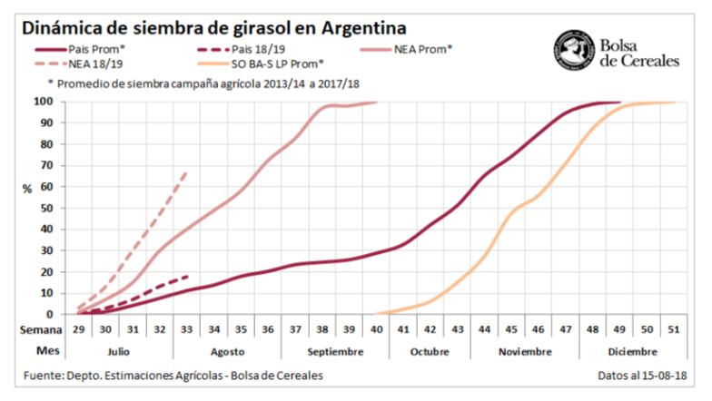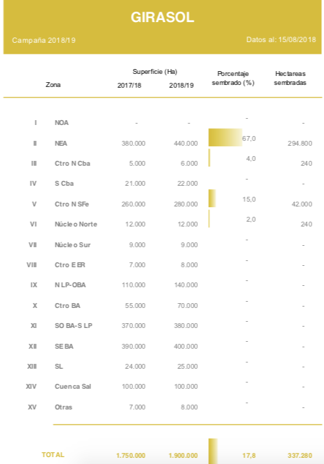 En paralelo, las regiones del centro y sur del área agrícola nacional mantienen un estado hídrico adecuado para la siembra de girasol, la cual comenzaría en las próximas semanas. De mantenerse buenas condiciones durante los próximos meses, en el Sudoeste de Buenos Aires-Sur de La Pampa el área para la campaña 2018/19 podría alcanzar las 380.000 hectáreas y las 400.000 hectáreas en el Sudeste de Buenos Aires.