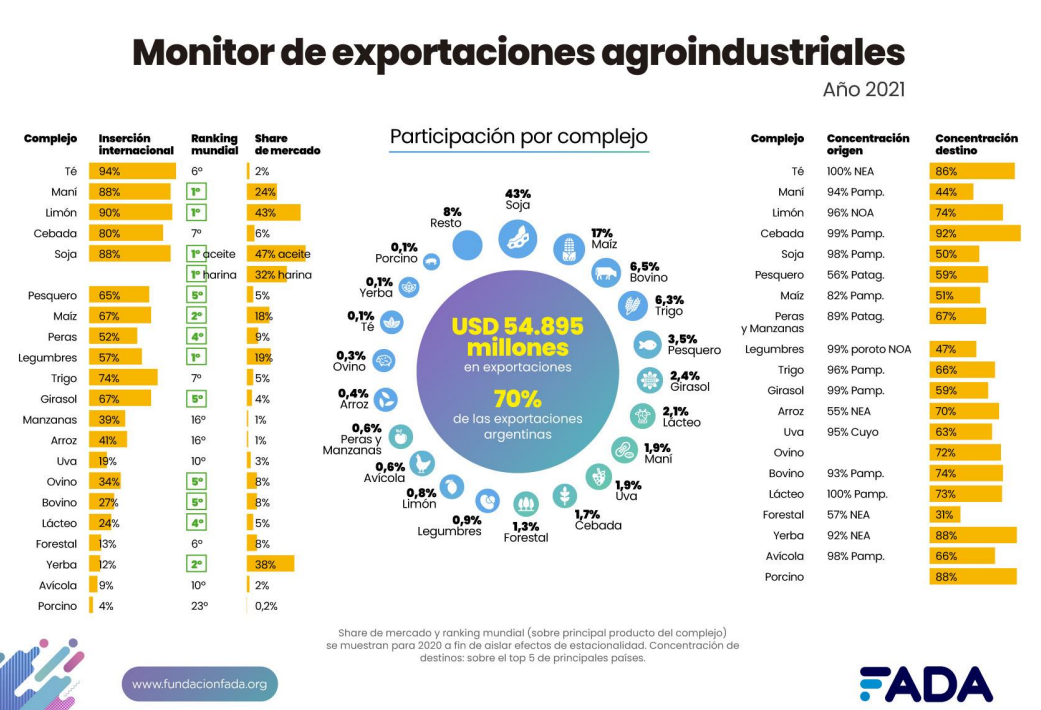 FADA (Fundación Agropecuaria para el Desarrollo de Argentina) publicó su Monitor de Exportaciones Agroindustriales con datos que no paran de sorprender: “Si no exportáramos, miles de puestos de trabajo no existirían. Argentina llega a 160 países con sus exportaciones agroindustriales. De todos los productos agroindustriales que andan dando vueltas en barcos por el mundo, el 11% lo producimos en Argentina. Es importante que todos sepamos por qué es bueno exportar para dejar atrás falsas creencias que confunden”, afirma Nicolle Pisani Claro, economista de FADA. El informe se presenta como una herramienta que permite visualizar el gran potencial exportador de Argentina: qué producimos, para quiénes, cuánto nos compran, en qué nos beneficia. Hay múltiples mitos en torno a los beneficios o perjuicios de las exportaciones y el estudio de FADA aporta a echar luz con datos y análisis.