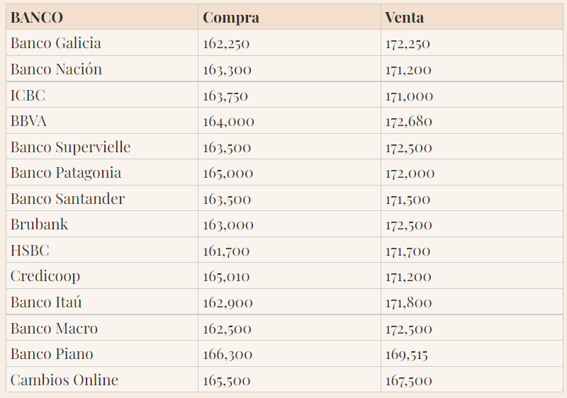 En cuanto al dólar oficial hoy miércoles 23 de noviembre, cotiza a $ 171,25 para la venta en las pantallas del Banco Nación.