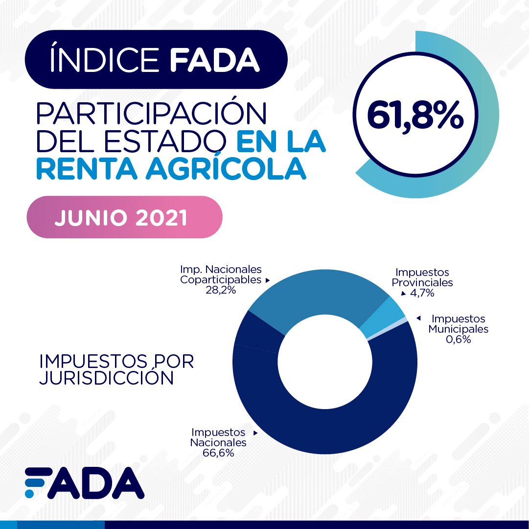 FADA (Fundación Agropecuaria para el Desarrollo de Argentina) publicó la medición trimestral que indica cuánto de lo que produce el campo se lo queda el Estado en impuestos. En junio 2021 se registró que 61,8% de la renta agrícola queda en los distintos niveles de gobierno. “En otras palabras: el productor en el campo vende su cosecha, a eso le resta los costos que tuvo para producirla. Una vez hecha esa cuenta, valor de la producción menos los costos, supongamos que da $100, de esos $100 el Estado se queda con $61,80 entre impuestos nacionales, provinciales y municipales”, explicó David Miazzo, Economista Jefe de FADA.