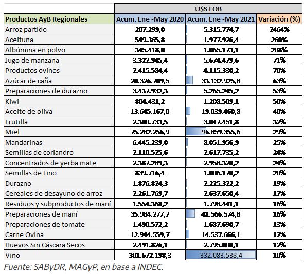 En tanto que aceituna, azúcar de caña, jugo de manzana, cereales de desayuno de arroz lograron sostener el mayor volumen exportado de los últimos 2 años; mientras que en arroz partido, el crecimiento interanual del período enero-mayo 2021 se debe, en parte a las exportaciones destinadas a Chile (1.961.376,1 U$S) y Países Bajos (278.688,0 U$S).