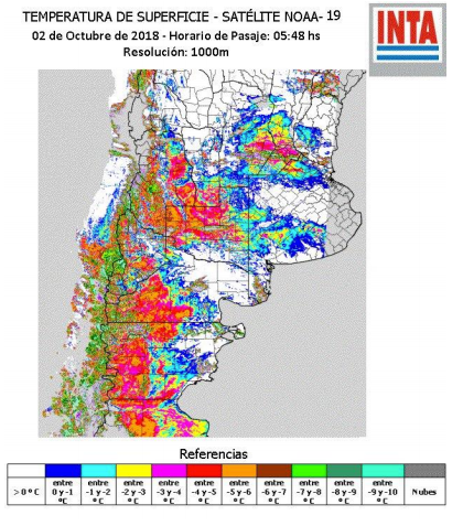 El 2 de Octubre del corriente año se registró una helada que según la estación meteorológica de la experimental del INTA Marcos Juárez fue de -3 °C, y duró más de 4 hs. Por otro lado la imagen satelital del sistema clima y agua INTA (http://climayagua.inta.gob.ar/), mostró que a las 5.48hs se registraron temperaturas de entre –4 a –5 °C a 5 cm del suelo en una zona que abarca el centro norte de los departamentos Unión y Marcos Juárez y centro sur de la provincia de Santa Fe (Figura 1). Las temperaturas de esta imagen se condicen con los niveles de daños observados.