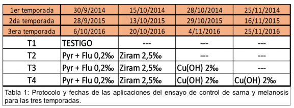 La sarna de los cítricos (Elsinöe sp) es una enfermedad cuarentenaria que, en la región citrícola del Río Uruguay, provoca importantes pérdidas de calidad comercial en mandarinas tempranas como Satsuma Okitsu, variedad muy susceptible. Por otro lado, melanosis (Diaphorte citri) si bien no es una enfermedad cuarentenaria, en plantas con presencia abundante de rama secas (fuente principal de inóculo) y más aún en temporadas primavero-estivales con elevadas precipitaciones, disminuye la calidad externa de los frutos. Para el control de ambas enfermedades se requiere disponer de fungicidas alternativos ante la aparición de posibles casos de resistencia, ajustes en los momentos de aplicación y manejo cultural para alcanzar calidad y rendimiento comercial. El objetivo del trabajo fue estudiar la eficacia de una estrategia de control químico y manejo cultural sobre ambas enfermedades. Se realizó un ensayo combinado de control químico y manejo cultural, durante tres temporadas consecutivas (2013/14/15), en un lote de mandarina Satsuma Okitsu, localizado en la EEA INTA Concordia, Entre Ríos. Este lote contaba con historia de alta infección de sarna y melanosis, con una importante presencia de ramas secas como consecuencia de las fuertes heladas registradas en la temporada 2012/13. Para el ensayo se empleó un diseño en bloques (4 tratamientos con 3 repeticiones) y parcelas divididas para el manejo cultural (con y sin poda de limpieza de ramas secas). Se contempló un testigo absoluto y los tratamientos incluyeron 2 aplicaciones específicas para sarna, una de fluxapyroxad + pyraclostrobin (0,2‰) y otra de ziram (2,5‰), a caída de pétalos y cuaje respectivamente. Adicionándose una o dos aplicaciones de cobre (Cu (OH) 2‰) para control de melanosis, considerando el pronóstico de lluvia en el período de fruto cuajado (Tabla 1).