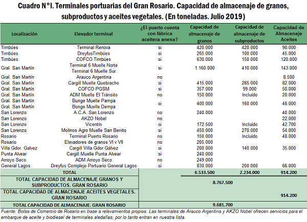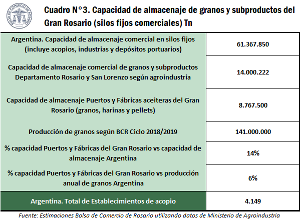 Si la capacidad de almacenaje comercial de República Argentina en silos y estructuras fijas asciende a 61.367.850 toneladas y la de las terminales portuarias que se encuentran ubicadas en el Gran Rosario es de 8.787.500 (suma de granos y subproductos), el Gran Rosario participa –entonces- con el 14% del total nacional. Por otra parte, la capacidad de almacenaje de las terminales portuarias del Gran Rosario equivale al 7% de la capacidad de almacenaje total de nuestro país, computando en esta última la de silos bolsas, estructuras fijas comerciales y las fijas de los productores agropecuarios. Todas estas cifras resaltan la importancia y significación de esta zona para una actividad que es generadora de la mayor fuente de divisas para nuestro país.