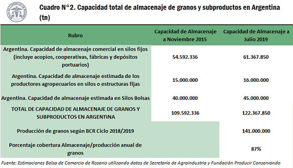 En dicha cifra no se incluye la capacidad de almacenaje en estructuras fijas de los productores agropecuarios que se estima en 16 millones de toneladas. Se estima, además, que la capacidad de almacenaje en silos bolsas ascendería anualmente a 45 millones de toneladas. En consecuencia, la República Argentina contaría con una capacidad de almacenaje total de granos y subproductos (fija y móvil) de 122 millones de toneladas. En esta cifra está computado el almacenaje con silos bolsas. Es prácticamente equivalente a la producción anual de granos de la República Argentina.