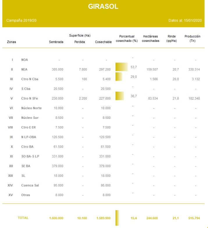 El progreso intersemanal de cosecha fue de 5,4 puntos porcentuales. La superficie recolectada asciende al 15,4 %, registrando una demora interanual de -5,1 pp. La proyección de producción se mantiene en 3,2 MTn.