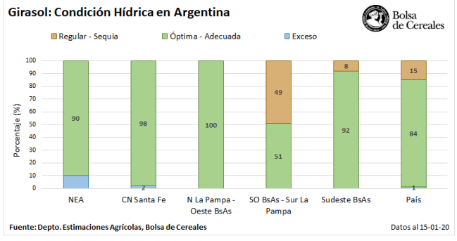 Luego de alcanzar un progreso intersemanal en las labores de cosecha de 5,4 puntos porcentuales, el porcentaje de área apta recolectada supera el 15 %. Respecto a la campaña pasada, se registra una demora de -5,1 puntos. En cuanto al área en pie, un 70 % de la superficie ya transita o supera el estadio de floración, acompañada de una mejora en la condición hídrica del cultivo de 2 puntos porcentuales. Al mismo tiempo mejoró la condición del cultivo a nivel nacional, aumentando en 1,6 puntos el área en condición normal y excelente.