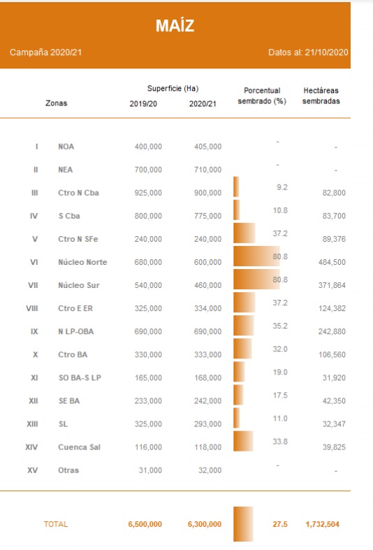La siembra cubre el 27,5 % de la actual proyección de 6,3 MHa para la campaña 2020/21. El avance intersemanal fue de 4,2 pp y mantiene una demora de 7,2 pp en comparación al ciclo previo.
