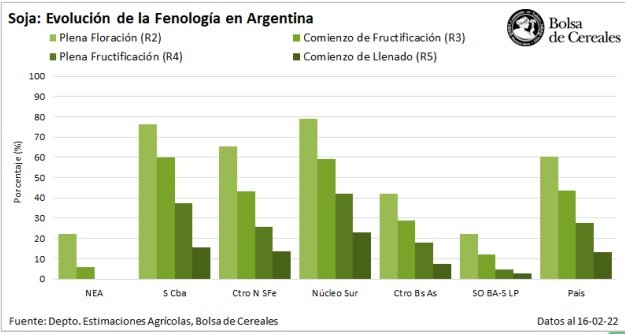 Sobre el extremo norte, donde se concentra el casi el 17% de las 16,3 MHa implantadas para la campaña 2021/22, la falta de humedad continúa demorando el crecimiento del cultivo. Al presente informe, unas 1,3 MHa en esta región reportan una condición hídrica regular a sequía, mientras que el 36,5% del área sembrada se encuentra iniciando floración (R1). En paralelo, pese a los ataques de trips y arañuelas, el Centro-Norte y Sur de Córdoba, Núcleo Sur y el Norte de La Pampa-Oeste de Buenos Aires, mantienen sus expectativas de rendimiento mientras que los cuadros más adelantados se encuentran en pleno llenado de grano (R6). Sin embargo, el Núcleo Norte, Centro-Norte de Santa Fe y el Centro-Este de Entre Ríos prevén mermas en los rendimientos en cuadros de soja de primera, como consecuencia de las altas temperaturas y la limitada disponibilidad hídrica durante el inicio del periodo crítico.