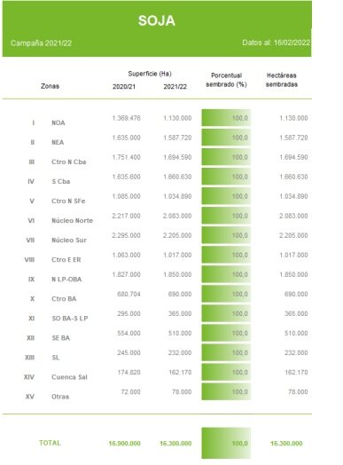 Finalmente, mientras que el Sur de La Pampa-Sudoeste de Buenos Aires reporta una mejora en los cuadros tras las lluvias registradas los últimos siete días, el Sudeste de Buenos Aires continúa reportando una condición hídrica regular a sequia sobre el 46,5% del área implantada. A la fecha, el 22 % de los cuadros de soja de primera sobre el sur del área implantada se encuentra iniciando su llenado de grano (R4), mientras que el 4% del área de soja de segunda inicia su periodo crítico de inicio de diferenciación de vainas (R3).