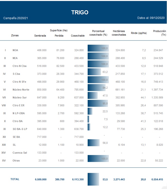 Hacia el Sudoeste de Buenos Aires, luego de recolectar poco más del 10 % de su área, se estima un rinde medio de 25,3 qq/Ha, muy próximo al promedio de los cinco años previos. Durante los próximos días comenzará la cosecha en el Sudeste de Buenos Aires, donde varios cuadros fueron apurados entre el calor y la interrupción de las lluvias, pero aún manteniendo elevadas expectativas de rinde.
