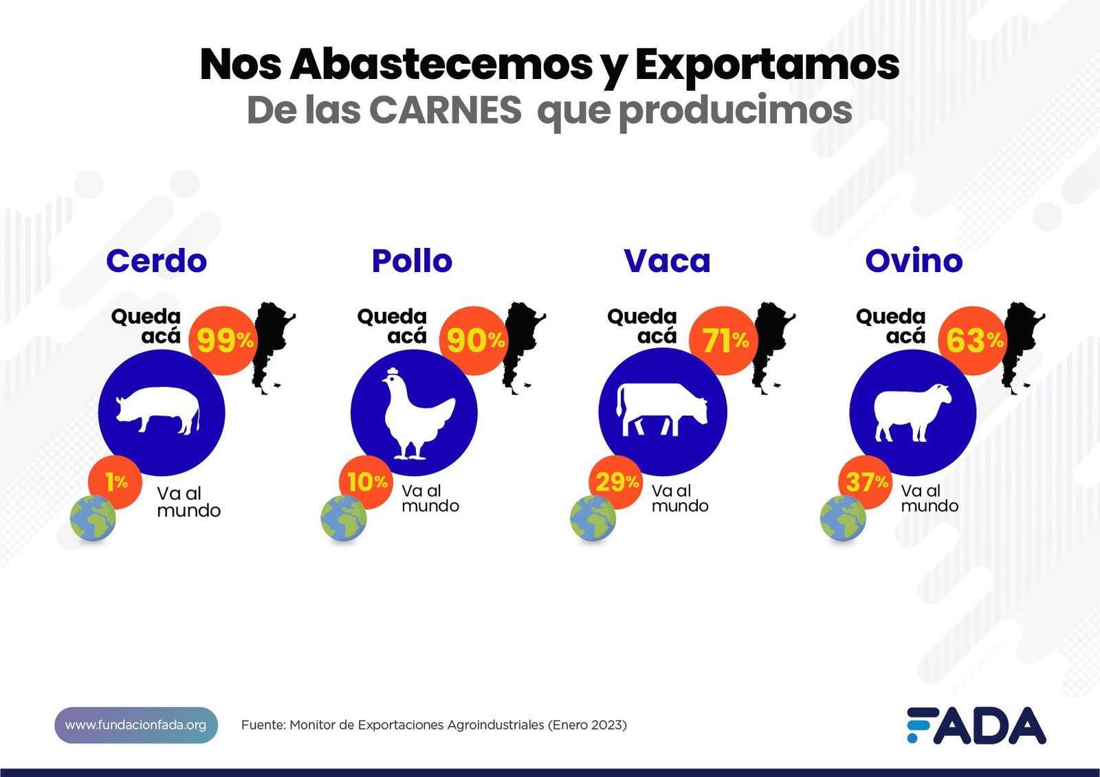 En el Monitor de FADA es posible descubrir que de las carnes que producimos acá: el 99% del cerdo queda para el consumo interno y sólo el 1% va al mundo. En el caso de la carne pollo el 90% queda y el 10% se exporta. El 71% de la carne de vaca es para los argentinos y el 29% se vende afuera. Por último, respecto a la carne ovina, el 63% queda en el mercado interno mientras que el 37% se exporta.