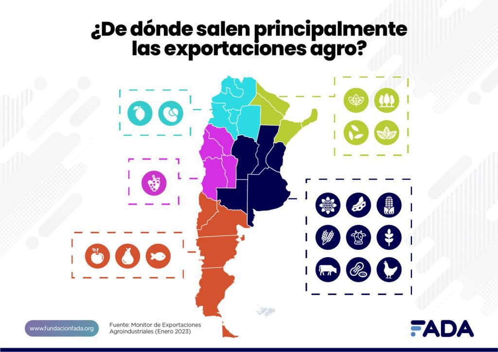 “Los productos agroindustriales salen desde cada rincón del país, es una actividad totalmente federal. Cada rincón de la Argentina tiene miles de trabajadores que se especializan en las producciones de esa región. Así, podemos ver que en la Patagonia lo que más se exporta son los rubros pesqueros, peras y manzanas. En la región pampeana son mayoría soja, maní, girasol, maíz, trigo, cebada, carne de vaca, lácteos y carne aviar. En cuyo prevalece la cadena vitivinícola. En el NEA lo que más se exporta es el complejo forestal, té, yerba y arroz. Por último, en el NOA se especializan en limón, porotos, y garbanzos”, afirma Miazzo.