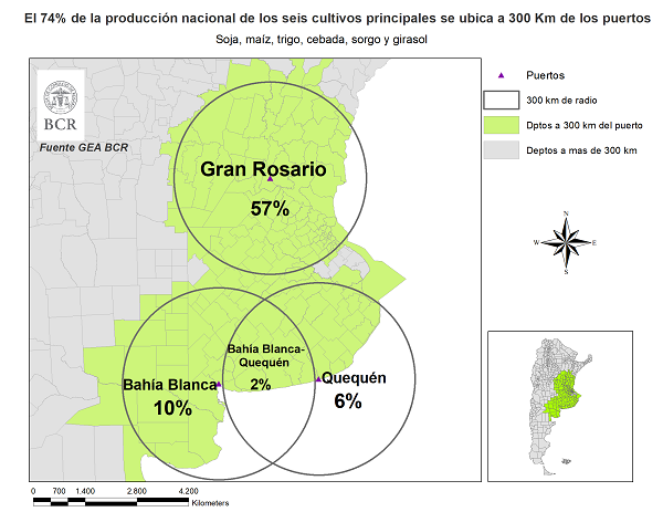 Esto implica que el 74% de la producción de estos seis cultivos se encuentra a 300 Km de algunos de los tres nodos portuarios principales de Argentina: Gran Rosario, Quequén y Bahía Blanca.