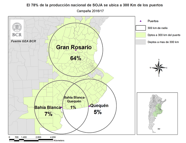 El cultivo más sembrado a nivel nacional, la soja, ubica un 64% de la producción nacional a 300 km de los puertos del Gran Rosario. Bahía Blanca y Quequén participan con el 7% y 5% respectivamente. El 78% de la producción de esta oleaginosa se encuentra a 300 Km de algunos de los tres nodos portuarios principales de Argentina: Gran Rosario, Quequén y Bahía Blanca.