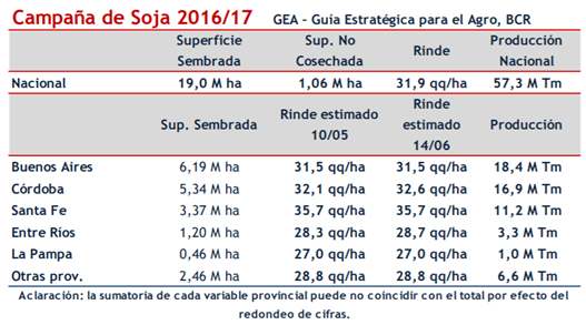 Según las cifras de estimaciones de GEA-BCR, la campaña 2016/17 finalizó con una cosecha récord de 57,3 Mt de soja y un rinde promedio de 31,9 qq/ha. La provincia de Buenos Aires participó con el 32% de la producción nacional de la oleaginosa, que en volumen significó 18,4 Mt. Le siguió Córdoba aportando 29% de su producción (16,9 Mt) y por último Santa Fe se ubicó en el tercer puesto con 11,2 Mt representando el 20% del volumen total. Pese a ello, la provincia santafecina logró conseguir los rendimientos más altos (35,7 qq/ha).