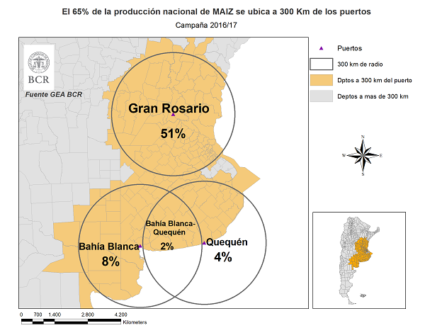 El maíz presenta un 51% de la producción nacional a 300 km del Gran Rosario, mientras que Bahía Blanca y Quequén muestran proporciones de 8% y 4% respectivamente. Los tres nodos acumulan el 65% de la producción nacional.