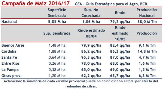 Según las estimaciones de GEA BCR, el maíz finalizó la campaña 2016/17 con 38 Mt a nivel nacional considerando un rinde promedio nacional de 79,2 qq/ha. La provincia que lideró en producción fue Córdoba con 14,7 Mt representando el 39% de la cifra a nivel nacional. Le sigue Buenos Aires con 9,2 Mt (24%) y Santa Fe finalizó con 4,6 Mt (12%).