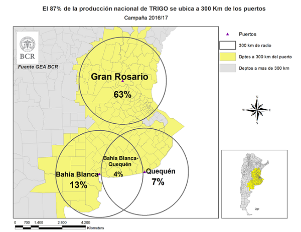 En el caso del trigo, los partidos más productivos se encuentran en el sur de la provincia de Buenos Aires, razón por la cual se despacha una parte importante del cereal en el mar Argentino. El 13% de la producción nacional de trigo se ubica a 300 Km de Bahía Blanca y el 7% a 300 Km de Quequén. Comparten un 4% de la producción nacional en la misma zona de influencia. Por otra parte, el Gran Rosario presenta un 63% de la producción nacional de trigo en un radio de 300 km con centro en la ciudad de Rosario.