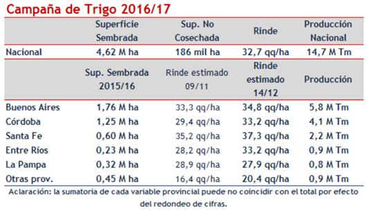 La cosecha de cereal de invierno 2016/17 quedó en 14,7 Mt, siendo la provincia de Buenos Aires la que se destaca aportando el 39% de la producción nacional (5,8 Mt). La provincia de Córdoba participó con 4,1 Mt (28%), mientras que Santa Fe contribuyó con 2,2 Mt de trigo (15%) logrando los mayores rendimientos (37,3 qq/ha).
