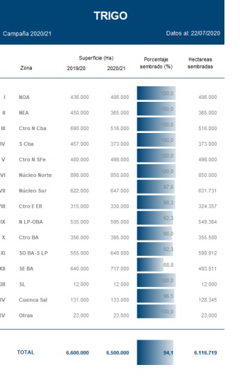 En el transcurso de la última semana se registró un progreso en las labores de implantación de 2,9 puntos porcentuales, marcando un avance de siembra nacional de 94,1 %. La disminución de la actividad responde a las permanentes lluvias focalizadas sobre sectores del sur del área agrícola, donde se concentra la mayor parte de los cuadros remanentes. En simultáneo, hacia el centro y norte de la misma, continúa el déficit de humedad, comprometiendo el rendimiento en los primeros lotes sembrados que transitan etapas de encañazón.