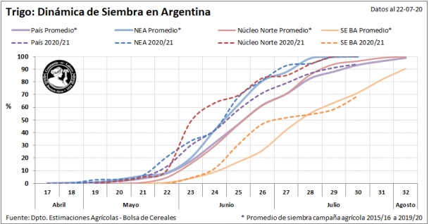 Por el contrario, en la franja norte del país, el cereal comienza a mostrar mermas de crecimiento y problemas de desarrollo. No solo a causa de la falta de precipitaciones, sino también por altas temperaturas registradas en la última semana, que aceleran el desarrollo e incrementan la demanda de agua. Puntualmente en el NOA, los primeros lotes inician estadíos de encañazón, y de no recibir agua en los próximos días podrían verse severamente comprometidos.