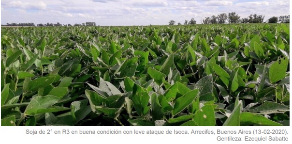 En términos generales, la mayor parte del área sembrada correspondiente a planteos de soja de primera en Córdoba, Santa Fe, Norte y Oeste de Buenos Aires y Norte de La Pampa, se encuentra iniciando o transitando plena fructificación y comienzo de llenado de grano (R4 y R5) mientras que, al mismo tiempo, también se relevan lotes más adelantados cercanos a máximo tamaño de semilla (R6) bajo una condición hídrica entre óptima y adecuada. Dichas zonas informaron ataques de plagas tales como isoca y enfermedades como mancha marrón, provocando pérdidas aislada de plantas. Sin embargo, las correspondientes medidas de control fueron aplicadas a lo largo de los últimos 7 días.