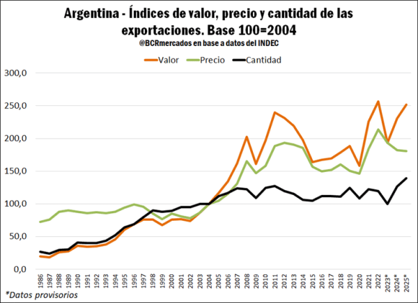 El crecimiento de las exportaciones en 2025 se explica principalmente por un fuerte aumento en las cantidades embarcadas. Mientras los precios internacionales mostraron una leve caída (-0,6%), el volumen exportado creció un 10%, alcanzando un récord histórico.