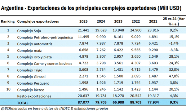 El peso del sector no solo se mide en participación total. Al analizar los principales complejos exportadores, el dominio es aún más evidente: 7 de los 10 principales rubros están ligados a la agroindustria.