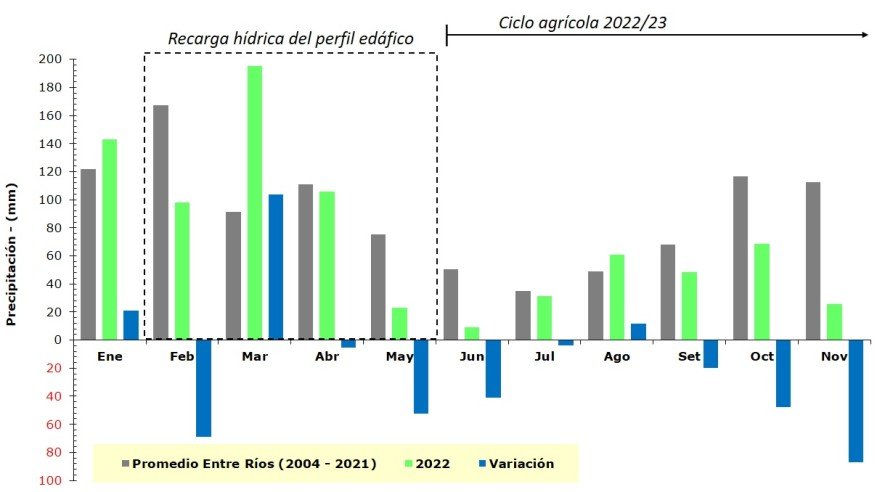 Por lo tanto, los departamentos del centro Sur de la provincia (que abarcan la más del 70 % de los cultivos estivales) presentan un déficit hídrico entre 200 a 350 mm, lo cual equivale a una disminución entre 47 a 81 % de la precipitación promedio normal.