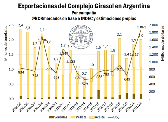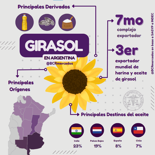 Con el girasol se generan exportaciones por más de US$ 1.800 millones, siendo el séptimo complejo exportador argentino. Argentina en el podio: el año pasado nuestro país se consolidó nuevamente como el tercer exportador mundial de aceite y harina de girasol, detrás de Ucrania y Rusia. El Complejo Girasol aportó cerca de $10.000 millones en derechos de exportación el año pasado.
