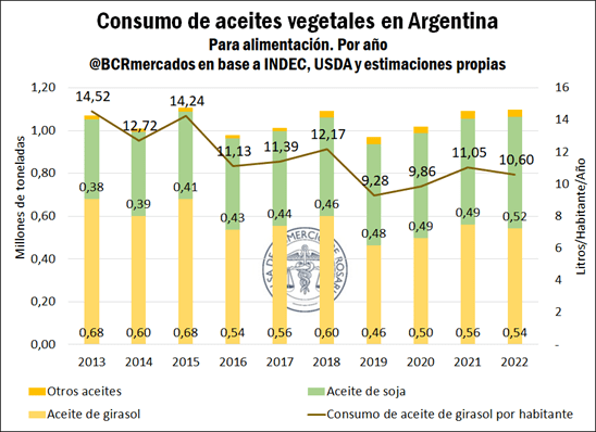Nota N°1: El aceite preferido en la mesa de los argentinos: consumimos más de 10 litros de aceite de girasol por habitante por año. Mas del 50% de la industrialización de girasol se ubica en el sur de la provincia de Buenos Aires. Santa Fe procesó cerca de un millón de toneladas de girasol en 2022, cerca del 30% del total nacional.