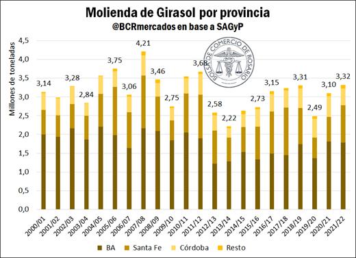 En términos de producción regional de aceite, la industrialización de girasol se ubica en relativa proximidad de la producción. En este sentido, la importancia del sur de la provincia de Buenos Aires en la producción de girasol le permite a esta provincia ser responsable de más del 50% del procesamiento industrial del cultivo en Argentina. Sin embargo, Santa Fe recuperó peso en el último año y vio crecer en más de un 51% su procesamiento de girasol respecto al 2021. Santa Fe procesó cerca de un millón de toneladas de girasol en 2022, cerca del 30% del total nacional