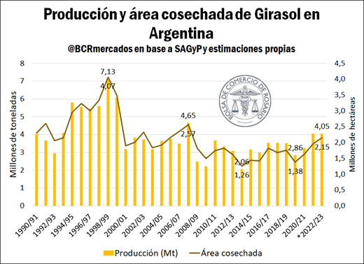En los últimos años se ha observado una tendencia creciente en el área sembrada de girasol en nuestro país. Desde uno de los mínimos históricos, en la campaña 2019/20, el área de girasol retomó la senda del crecimiento de superficie y de producción. No obstante, el área sembrada en la última campaña se ubica cerca de un 25% debajo del máximo de este siglo y un 54% por detrás del máximo histórico de superficie y producción, el año comercial 1998/99. En lo coyuntural, la campaña 2022/23 trae consigo un incremento de casi el 15% en la superficie sembrada, aunque la producción sería de la misma magnitud que la campaña que acaba de terminar en vista de la caída del rinde por la sequía.