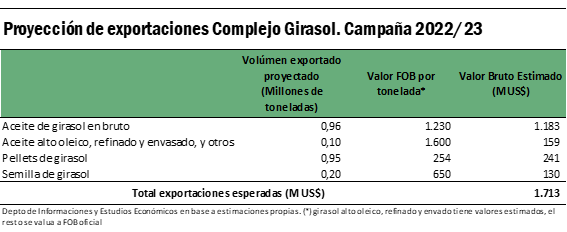 Poniendo el foco en la venidera campaña 2022/23, si valuamos lo que se espera exportar en este año a valores de exportación oficiales (con la excepción de los productos refinados/envasados, para los que se usaron estimaciones propias) podríamos estar hablando de exportaciones totales del Complejo Girasol por un valor cercano a US$ 1.713 millones de dólares. Si bien este valor se encuentra por debajo de la campaña 2021/22, estaríamos nuevamente en un robusto nivel de generación de divisas, que persistiría cómodamente por encima del resto de los años anteriores.