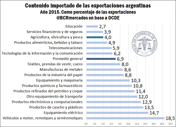 El sector agropecuario, parcialmente aglomerado en la cuenta Agricultura, Silvicultura y Pesca de las cuentas nacionales, reviste una importancia fundamental al aportar divisas para la sostenibilidad de las cuentas externas argentinas. En este sentido, además de su importantísima participación exportadora, el contenido importado de las exportaciones de este sector se ubica apenas en torno al 4%. Este guarismo es notoriamente menor al promedio general de la economía, casi del 7%. Además, se encuentra aún más lejos de las proporciones de importaciones de algunas ramas manufactureras con elevados eslabonamientos con el exterior. Muchos complejos manufactureros del agro también pueden encontrarse agrupados en el sector Productos alimenticios, bebidas y tabaco, que también dispone de un porcentaje de contenido importado menor al 5%.
