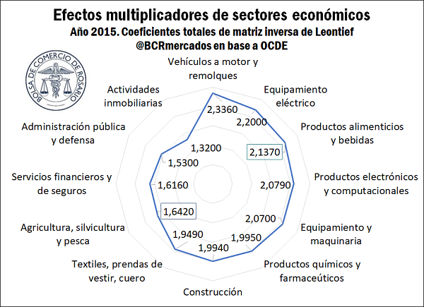 En cuanto al aporte para recuperar la actividad económica luego del fatídico año 2020, las industrias relacionadas al agro disponen de importantes efectos multiplicadores sobre la economía en sus diversos eslabones. Se estima que por cada $1 que sube la demanda de bienes finales del sector Agricultura, silvicultura y pesca, la actividad económica crece en $1,64; en tanto que por cada $1 de incremento en la demanda de productos alimenticios y bebidas la actividad económica crece $ 2,14, de acuerdo con la matriz insumo-producto desarrollada para Argentina por la OCDE.