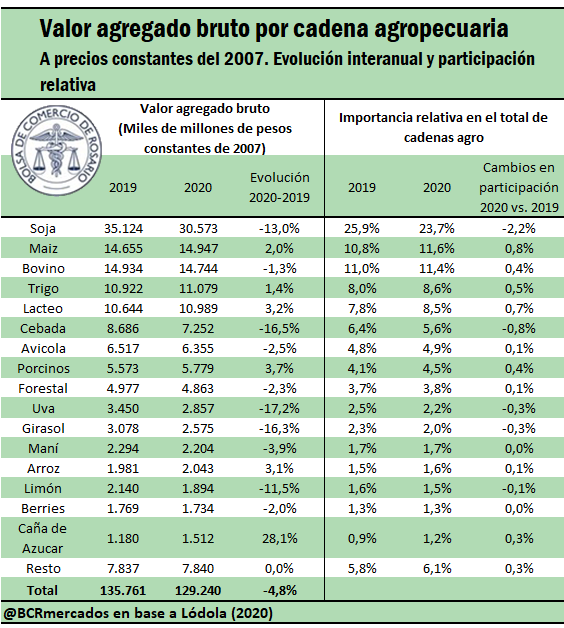 V. Pese a la caída del 5% en el Valor Agregado Bruto de la cadena agropecuaria en el 2020, la participación de la agroindustria en el PBI argentino creció al 17%, un máximo más de 20 años.