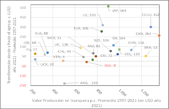 Gráfico 1: Transferencias por habitante en cada país desde el sector agropecuario al resto de su economía vs. Valor de la producción en tranquera por habitante (Promedio 1997-2021, expresado en USD constantes del año 2021)