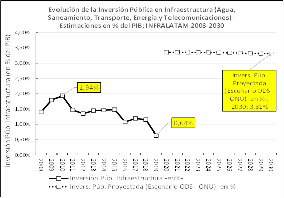 A fin de evaluar la magnitud de la reasignación propuesta es nuevamente conveniente recurrir a cifras comparativas. El Banco Interamericano de Desarrollo (BID), la Corporación Andina de Fomento (CAF) y la Comisión Económica para América Latina y el Caribe (CEPAL) constituyeron INFRALATAM, una alianza estratégica para medir los principales rubros de la inversión pública en infraestructura latinoamericana. Asimismo, estimaron cual sería la inversión necesaria para alcanzar los Objetivos de Desarrollo Sostenible de Naciones Unidas (ODS) para el año 2030.