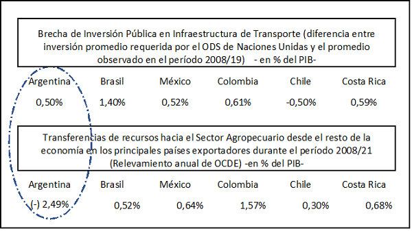 El cuadro 1 también refleja que dentro del propio Mercosur el sector agropecuario argentino transfiere hacia el resto de su economía el equivalente proporcional a cinco veces de lo que Brasil recibe proveniente desde sus otros sectores económicos. Esta relación de cinco a uno, con signo inverso entre los dos países, se comprueba por la diferencia de precios agrícolas internos a favor de Brasil y el mayor apoyo gubernamental al sector que son contrarrestados parcialmente por menores costos de insumos en Argentina y una mayor productividad en la agricultura. Esa ventaja competitiva que acorta diferencias se vería aún más beneficiada por una sustancial mejora logística a partir de la reinversión del 20% de los recursos que transfiere.