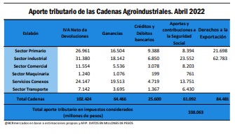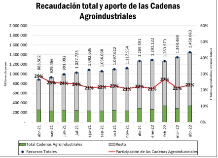 El aporte de estos sectores en el cuarto mes del año conlleva un incremento del 18% con relación a marzo, al tiempo que representa el 23,3% del total recaudado por el Estado Nacional en el mes de referencia, 2,1 puntos porcentuales de mejora entre meses. En el primer cuatrimestre del año las Cadenas Agroindustriales habrían aportado ya un total cercano a los $ 1,2 billones, un crecimiento del 42% en relación con el mismo período de 2021.