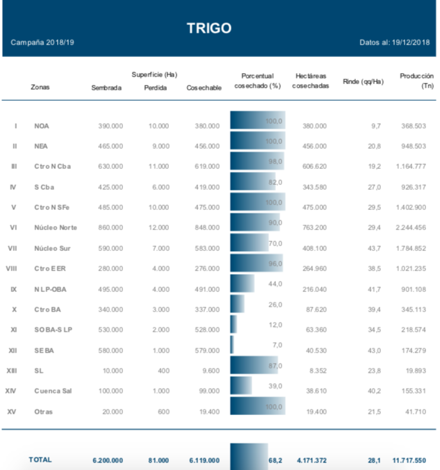 Luego de una semana con gran actividad de cosecha en las regiones del centro del país, la recolección del cereal logró alcanzar 68,2 % del área implantada a nivel nacional. El rinde medio ascendió 1 qq/Ha y se ubicó en 28,1 qq/Ha, permitiendo acumular una producción parcial superior a las 11.700.000 toneladas. A su vez, en el Sudeste de Buenos Aires se relevaron las primeras cosechas de lotes tempranos con buenas expectativas de rendimiento, permitiendo mantener la proyección de producción en 19.000.000 toneladas, un 7 % por encima de la campaña 2018/19.