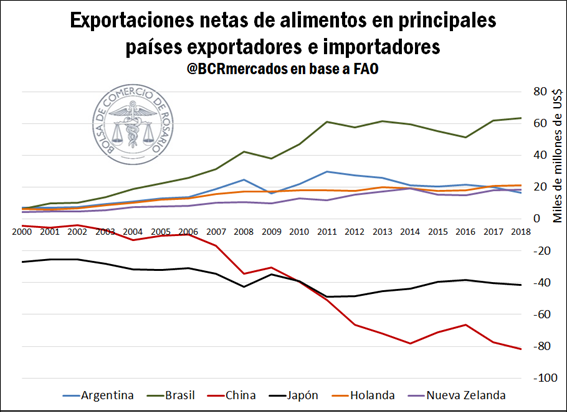 La República Federativa de Brasil es, según la FAO, líder mundial como exportador neto de alimentos. Así, aún a pesar de ser un país con más de 212 millones de habitantes, exporta muchos más alimentos de los que importa. Específicamente, nuestro vecino país se constituye como principal exportador mundial de poroto de soja y segundo mayor exportador de maíz (solo por detrás de Estados Unidos). Es, asimismo, el principal despachante de carne bovina y aviar al mundo, en tanto ocupa el segundo puesto en envíos de carne porcina, nuevamente, por detrás de EEUU.