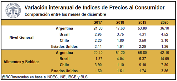 Inflación y suba del precio de los alimentos durante el 2020 en países seleccionados. Comparación con el caso argentino.