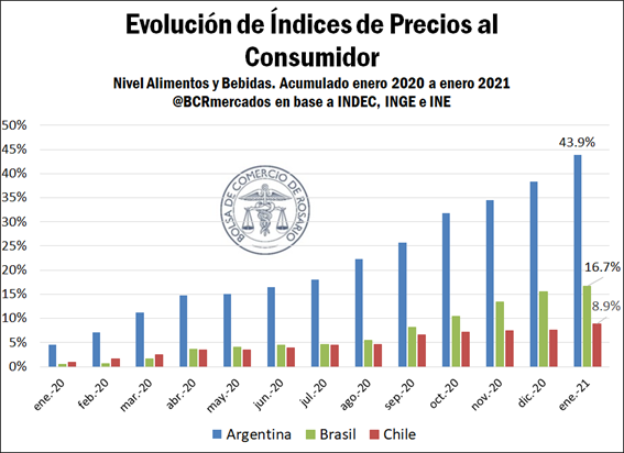 Un dato llamativo: Comparativamente, el aumento en los precios de los alimentos en Argentina fue menor que el registrado en Brasil y Chile si lo comparamos con el incremento en el índice de precios al consumidor nivel general registrado en cada país