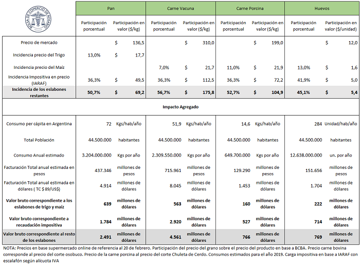 Lo mismo sucedería con el precio de la carne, pudiendo demostrarse que el impacto del precio del grano que se usa como alimento del animal no influye decisivamente en el precio final de venta al consumidor. Siguiendo nuevamente a BCBA, en un corte típico cómo el asado, la influencia del precio del maíz sobre el precio en góndola alcanza un 7%, mientras la carga tributaria representaría más del 30% del precio según informe del año 2020 del IARAF (Instituto Argentino de Análisis Fiscal).